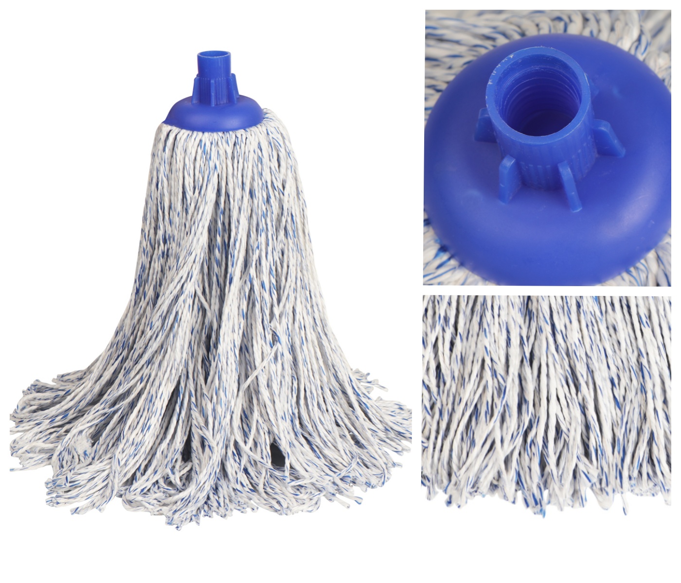 Dieser langlebige Moppkopf besteht aus weißem Baumwollmischgarn mit blauen Flecken, gepaart mit einem stabilen blauen Kunststoff-Schraubsockel. Entwickelt für hohe Saugfähigkeit und lang anhaltende Leistung, eignet es sich ideal für das Nasswischen im privaten und gewerblichen Bereich und bietet zuverlässige Reinigungskraft für den täglichen Gebrauch.