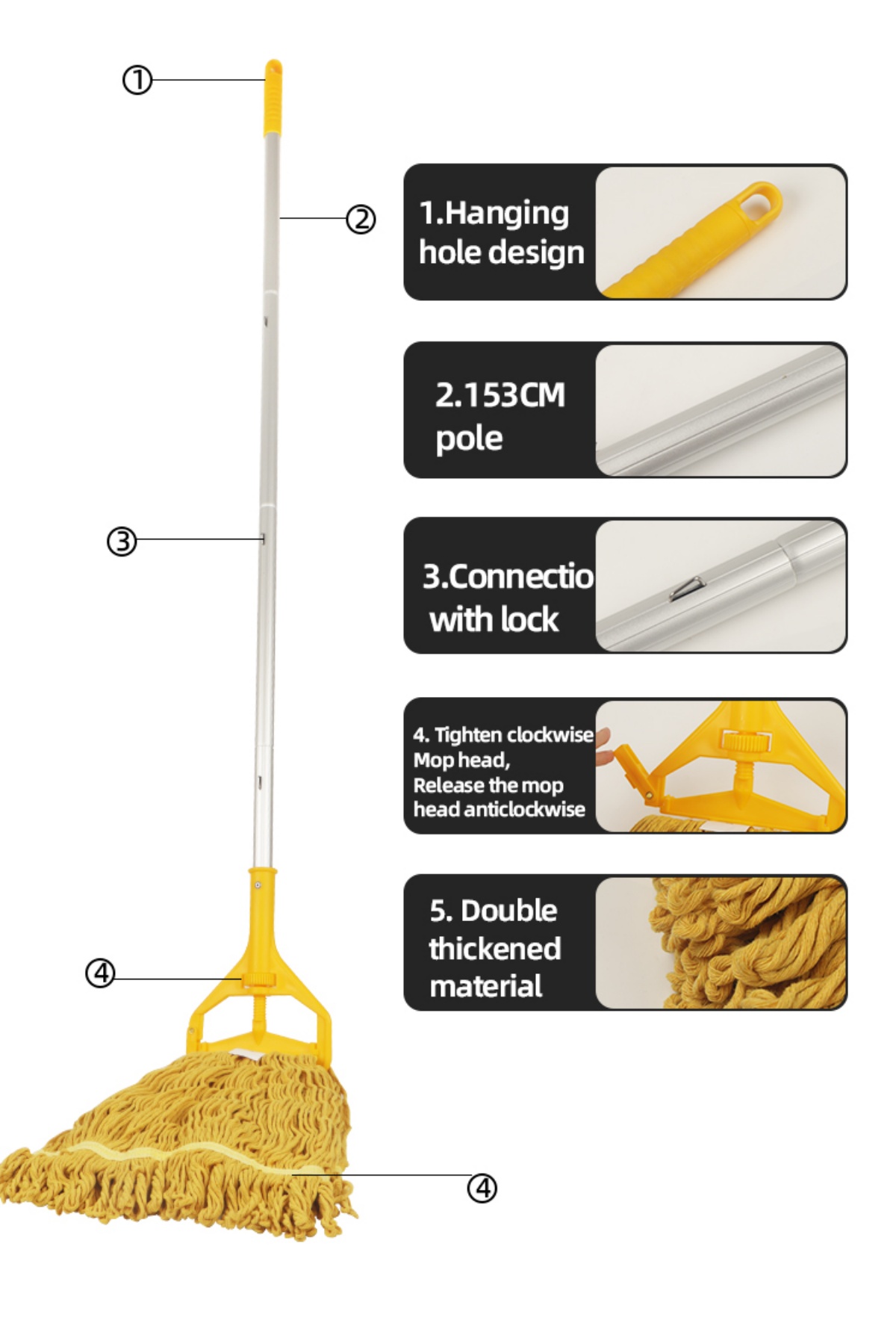 Der handelsübliche Loop-End-Mopp, bestehend aus einer gespleißten Aluminiumstange und einem Loop-Moppkopf, bietet eine effiziente und flexible Reinigungslösung. Die Aluminiumstange kann in der Länge frei eingestellt werden, um sich an unterschiedliche Reinigungsanforderungen in der Höhe anzupassen, was ideal für Hotels, Krankenhäuser, Lagerhäuser und andere hochintensive Reinigungsszenarien ist.
